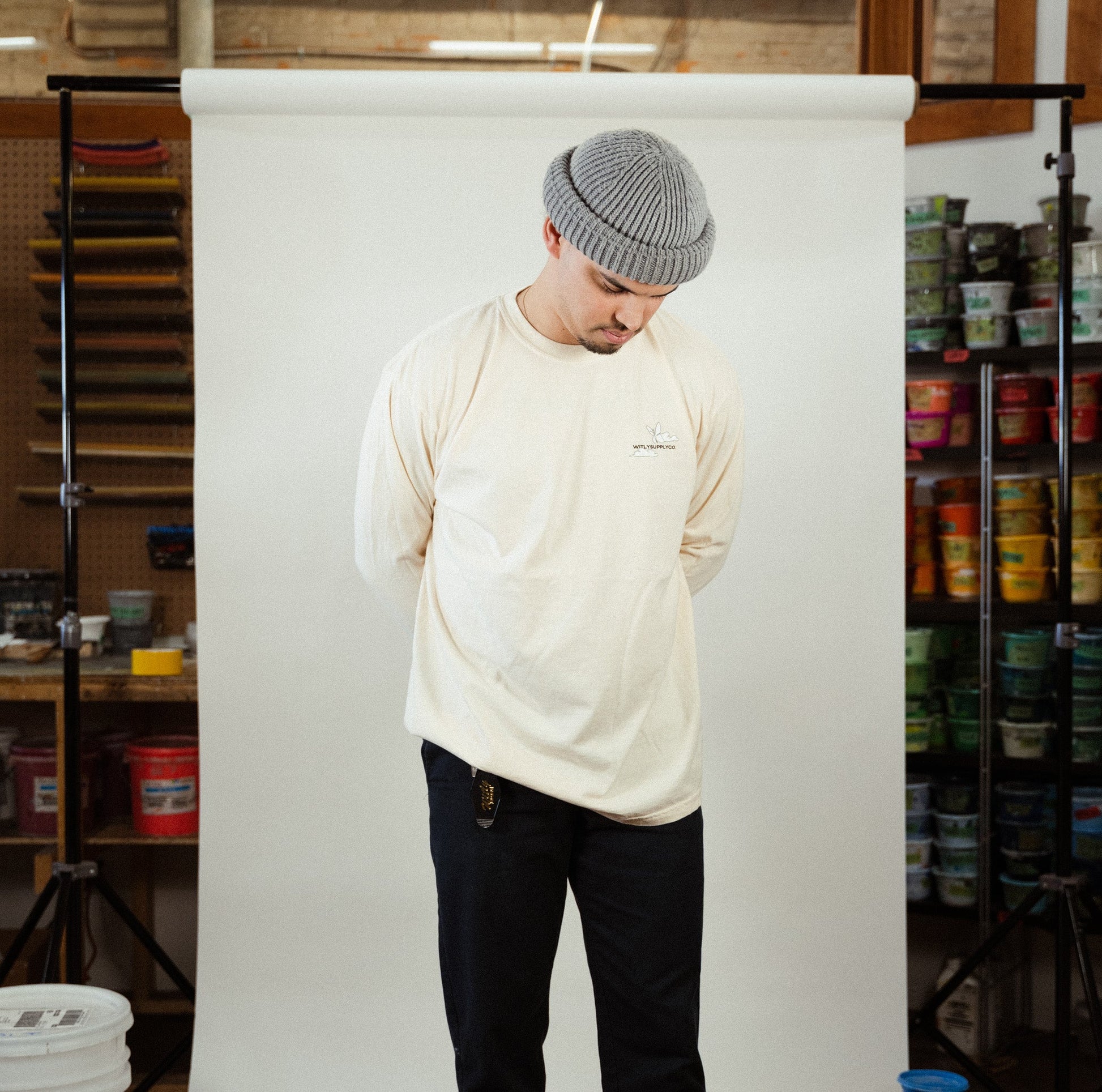 A preshrunk, heavy weight, pigment dyed, long sleeve tee, available in ivory or pepper.